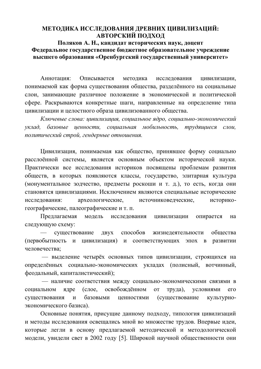 Методика исследования древних цивилизаций: авторский подход // Наука и образование: фундаментальные основы, технологии, инновации: материалы Всероссийской научно-методической конференции; Оренбург. гос. ун-т. – Электрон. дан. – Оренбург: ОГУ, 2025. С. 225-230.