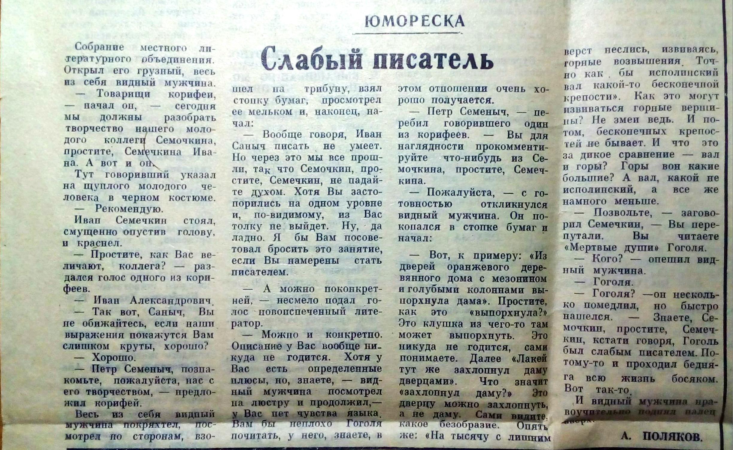 Собрание местного литературного объединения. Открыл его грузный, весь из себя видный мужчина. — Товарищи корифеи, – начал он, – сегодня мы должны разобрать творчество нашего молодого коллеги Семочкина, простите, Семечкина Ивана. А вот и он. Тут говоривший указал на щуплого молодого человека в чёрном костюме. — Рекомендую. Иван Семечкин стоял, смущённо опустив голову, и краснел. — Простите, как Вас величают, коллега? – раздался голос одного из корифеев. — Иван Александрович. — Так вот, Саныч, Вы не обижайтесь, если наши выражения покажутся Вам слишком круты, хорошо? — Хорошо. — Пётр Семёныч, познакомьте, пожалуйста, нас с его творчеством, – предложил корифей. — Весь из себя видный мужчина покряхтел, посмотрел по сторонам, взошёл на трибуну, взял стопку бумаг, просмотрел её мельком и, наконец, начал: — Вообще говоря, Иван Саныч писать не умеет. Но через это мы все прошли, так что Семочкин, простите, Семечкин, не падайте духом. Хотя Вы застопорились на одном уровне и, по-видимому, из Вас толку не выйдет. Ну, да ладно. Я бы Вам посоветовал бросить это занятие, если Вы намерены стать писателем. — А можно поконкретней, – несмело подал голос новоиспечённый литератор. — Можно и конкретно. Описание у Вас вообще никуда не годится. Хотя у Вас есть определённые плюсы, но, знаете, – видный мужчина посмотрел на люстру и продолжил, – у Вас нет чувства языка. Вам бы неплохо Гоголя почитать, у него, знаете, в этом отношении очень хорошо получается. — Пётр Семёныч, – перебил говорившего один из корифеев, – Вы для наглядности прокомментируйте что-нибудь из Семочкина, простите, Семечкина. — Пожалуйста, – с готовностью откликнулся видный мужчина. Он покопался в стопке бумаг и начал: — Вот, к примеру: «Из дверей оранжевого деревянного дома с мезонином и голубыми колоннами выпорхнула дама». Простите, как это «выпорхнула»? Это клушка из чего-то там может выпорхнуть. Это никуда не годится, сами понимаете. Далее: «Лакей тут же захлопнул даму дверцами». Что значит «захлопнул даму»? Это дверцу можно захлопнуть, а не даму. Сами видите, какое безобразие. Опять же: «На тысячу с лишним вёрст неслись, извиваясь, горные возвышения. Точно как-бы исполинский вал какой-то бесконечной крепости». Как это могут извиваться горные вершины? Не змеи ведь. И потом, бесконечных крепостей не бывает. И что это за дикое сравнение – вал и горы? Горы вон какие большие! А вал, какой не исполинский, а всё же намного меньше. — Позвольте, – заговорил Семечкин, – Вы перепутали. Вы читаете «Мёртвые души» Гоголя. — Кого? – опешил видный мужчина. — Гоголя. — Гоголя? – он несколько помедлил, но быстро нашёлся. — Знаете, Семочкин, простите, Семечкин, кстати говоря, Гоголь был слабым писателем. Потому-то и проходил бедняга всю жизнь босяком. Вот так-то. И видный мужчина нравоучительно поднял палец вверх. «Маяк». 28 июля 1990 года. | |